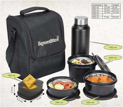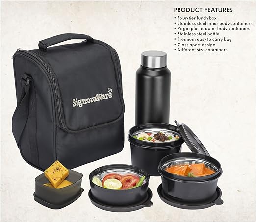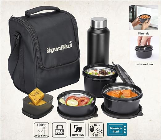 Signor aware Monarch Premium Microwave Safe Lunch Box (3 Stainless Steel Containers + Pickle Box + Steel Bottle + Insulated Bag) (500ml+350ml+200ml+100ml +700ml Bottle, Set of 5, Black Office Series)