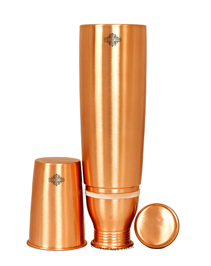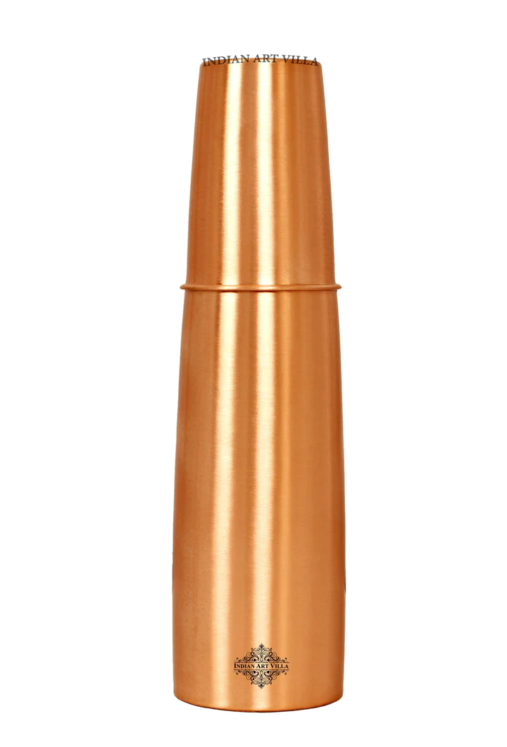 Indian Art Villa Brings Best Quality Steel Copper Pitcher / Jug Shaped Water Bottle with a Designer Cap / Lid. We also offer Easy returns & exchanges. T&C Applied. Water stored overnight in copper utensil has innumerable health benefits. It has anti bacterial properties that helps purify water & remove toxins. It aids digestion & Weight loss. It protects us from diseases like arthritis, anaemia, blood pressure, hyper thyroid, cancer and relieves us of joint pains. It has immense skin benefits too. Copper is an Antioxidant and anti-carcinogenic that prevents cell damage and slows aging. Copper is primary element to produce melanin (pigmentation of eyes, hair and skin) in human body. One should make it a habit of drinking water stored in copper utensils so as to keep themselves healthy. Storing water in copper bottles is eco-friendly and hygienic. It maintains the temperature of water Longer than usual.